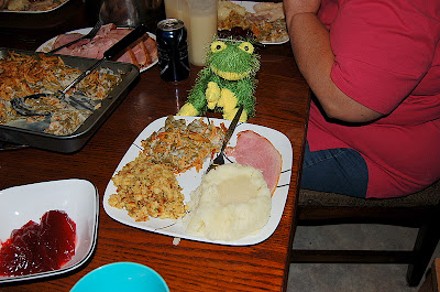 But Fredrick was happy to share my plate of ham, mashed potatoes and gravy, green bean casserole, stuffing and cranberries with me. (Lil' Turkey was too upset to eat!)
